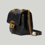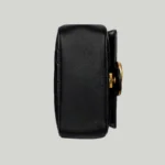 The GG Marmont has become synonymous with the House. thanks to its recognizable matelassé fabric and Double G hardware. Continuously reinvented through the seasons. new shapes are introduced within this signature line. matching Gucci’s contemporary vision. Here. it’s presented in black leather and further enriched with antique gold-toned details.