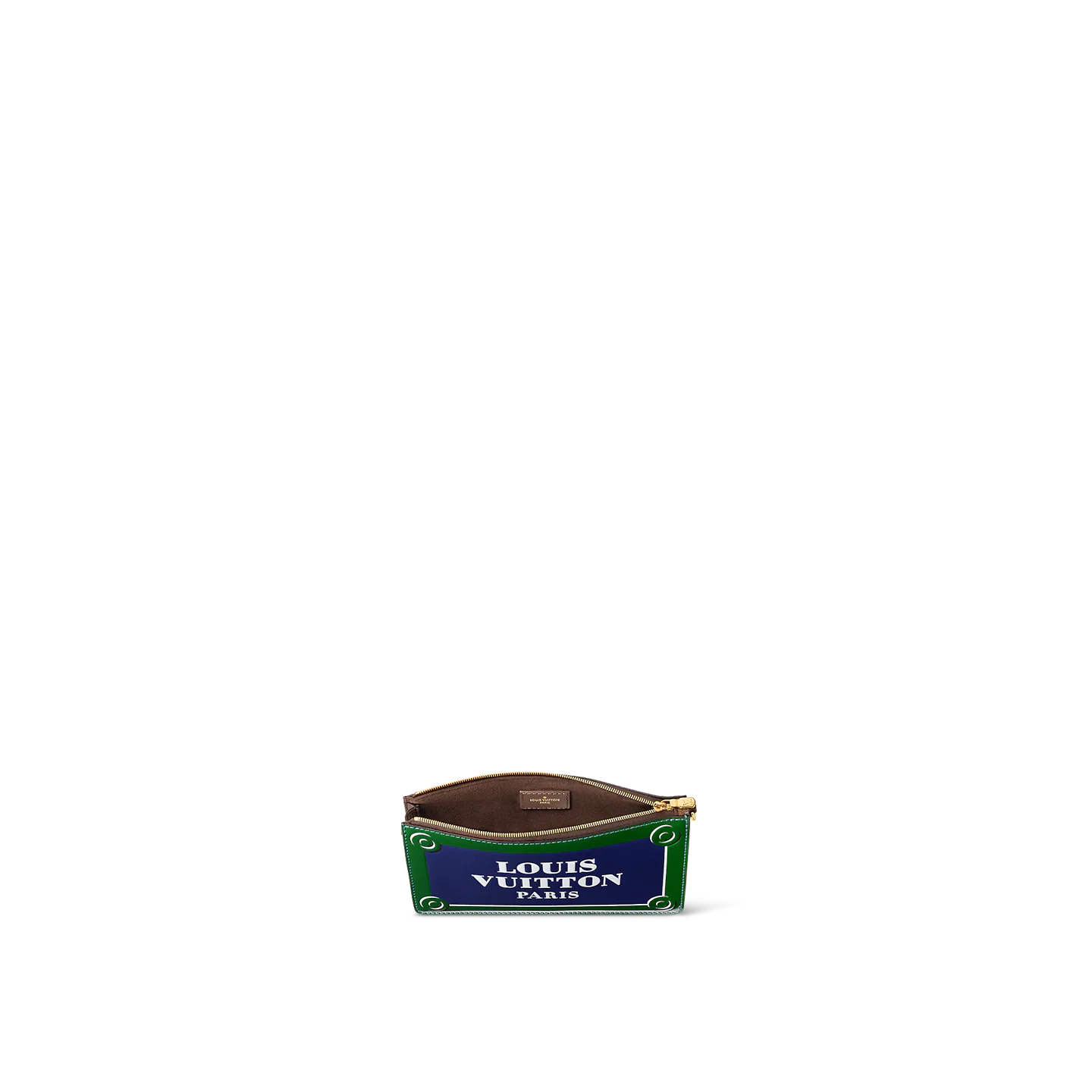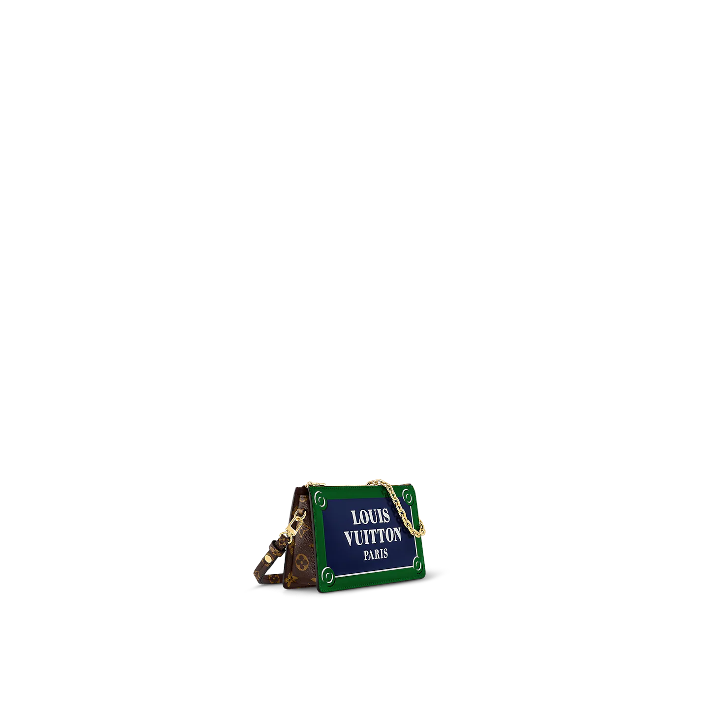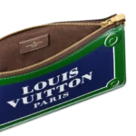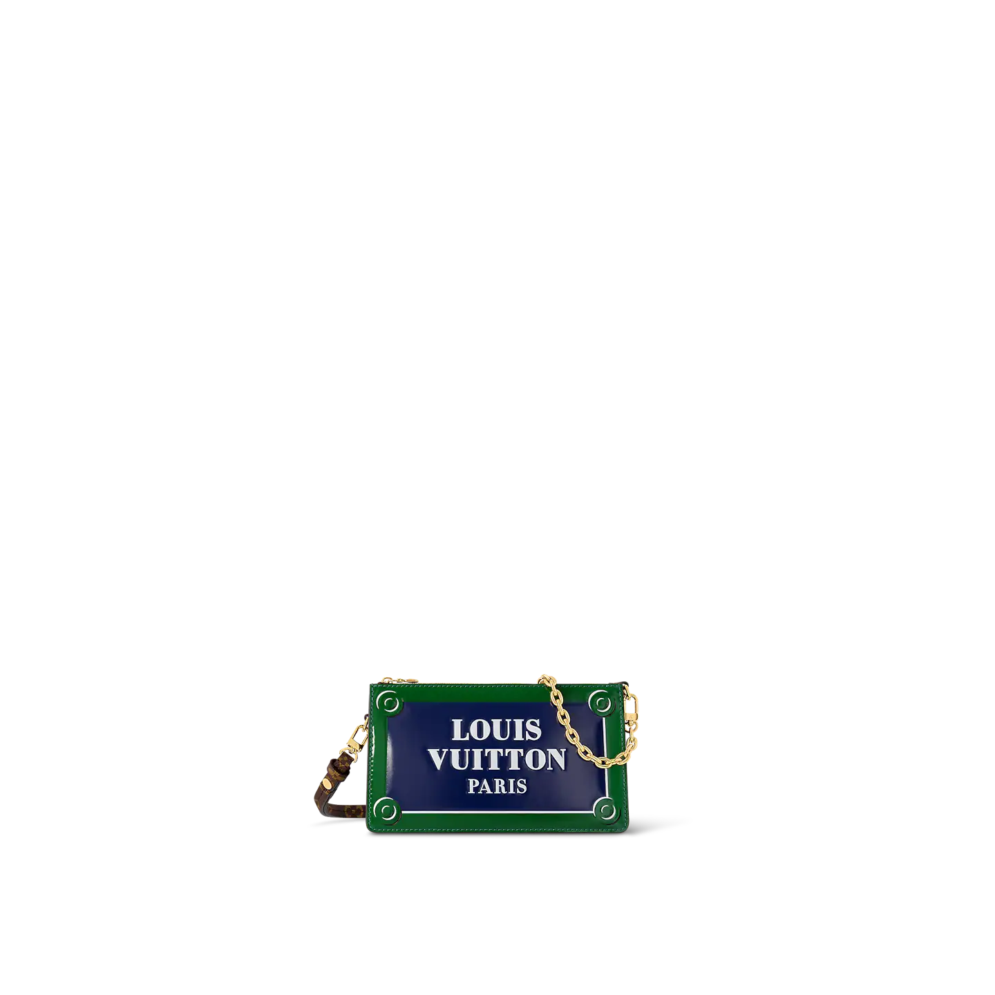The Lexington Pouch is made from calf leather and features an all-over glossy print of a Parisian street-sign that says Louis Vuitton Paris in bold white letters. This zipped pouch offers a number of carry options thanks to a detachable chain and a removable. adjustable strap.