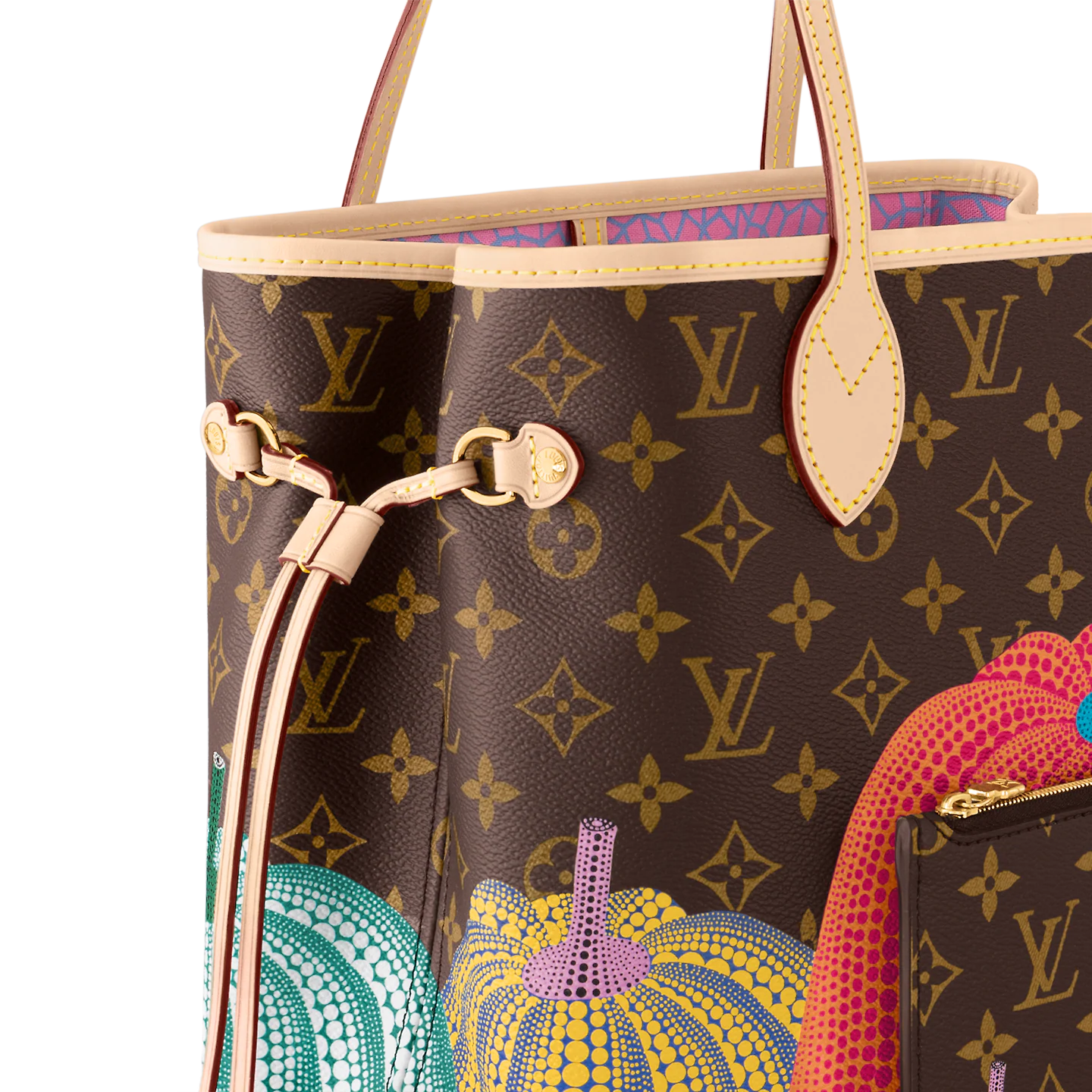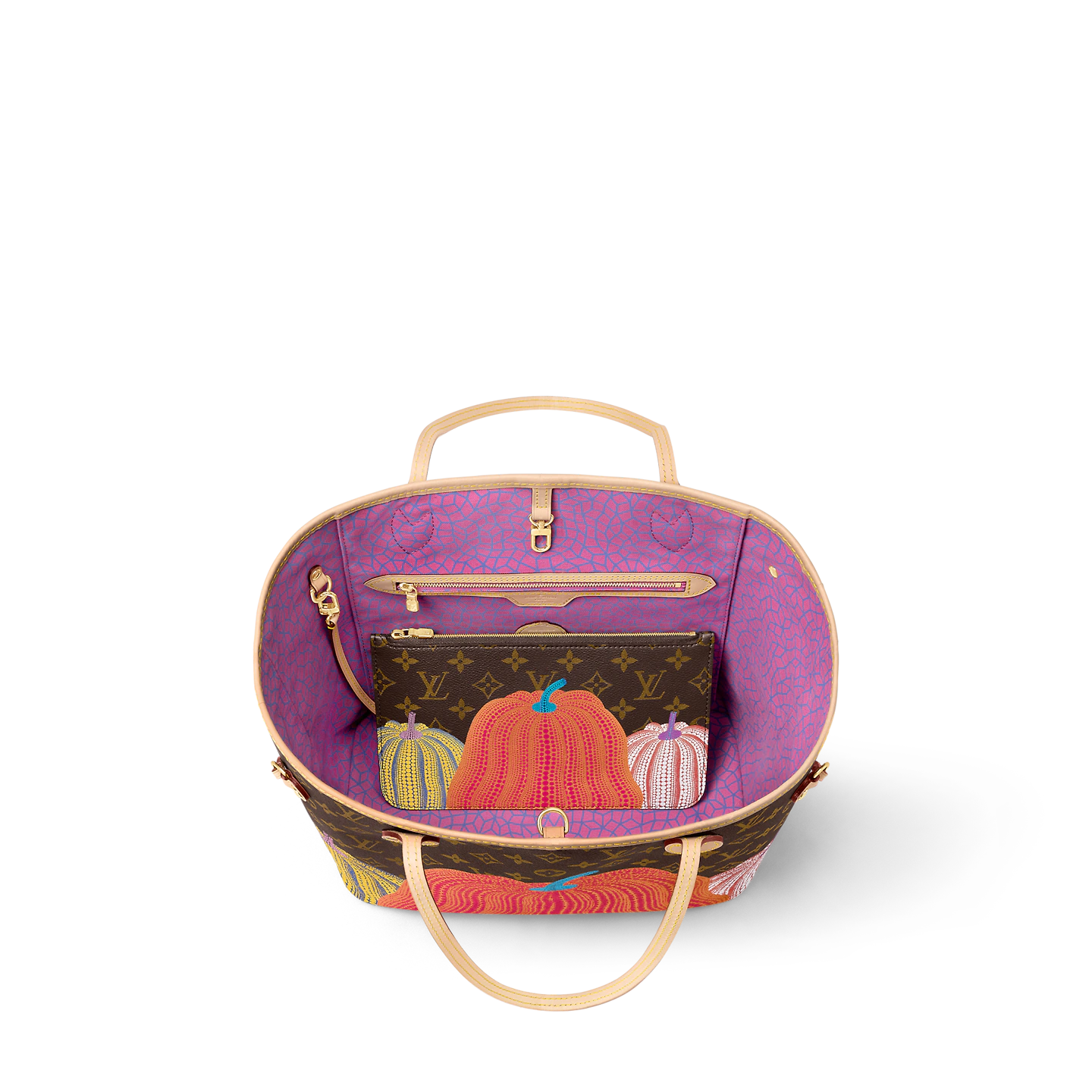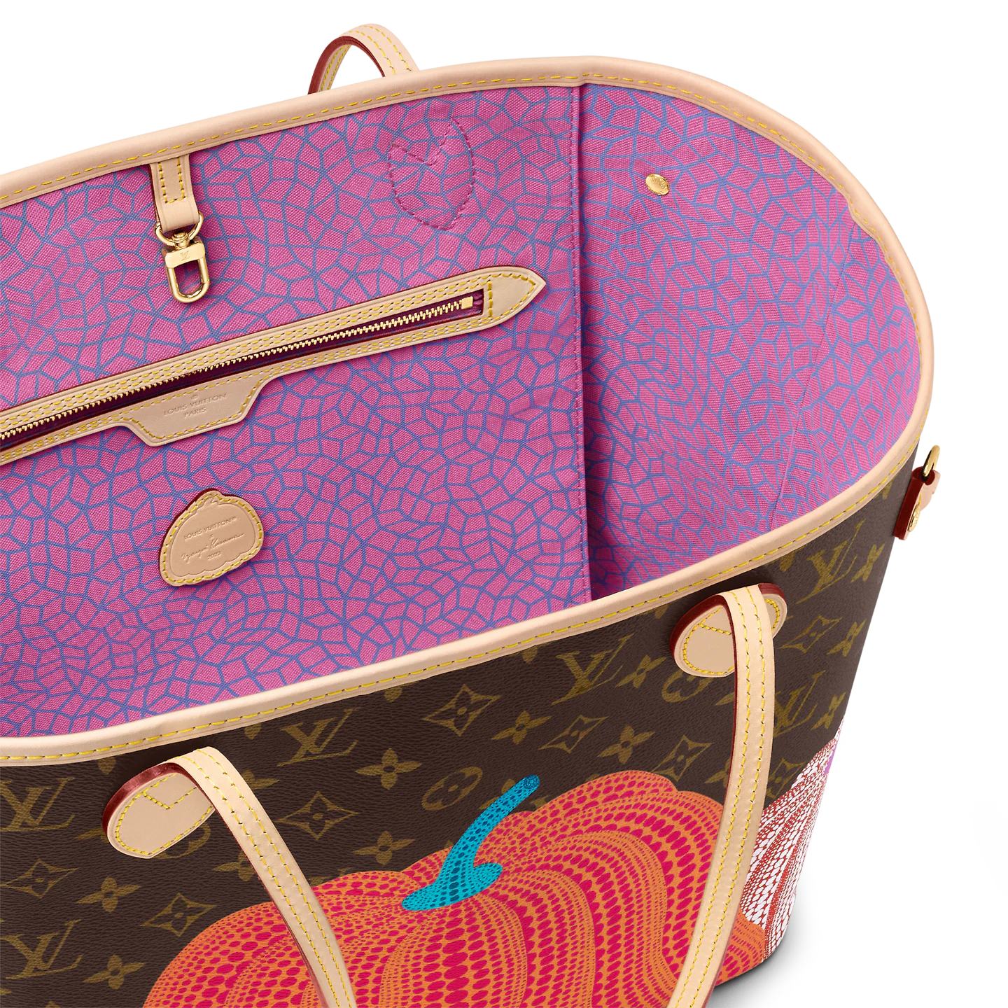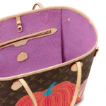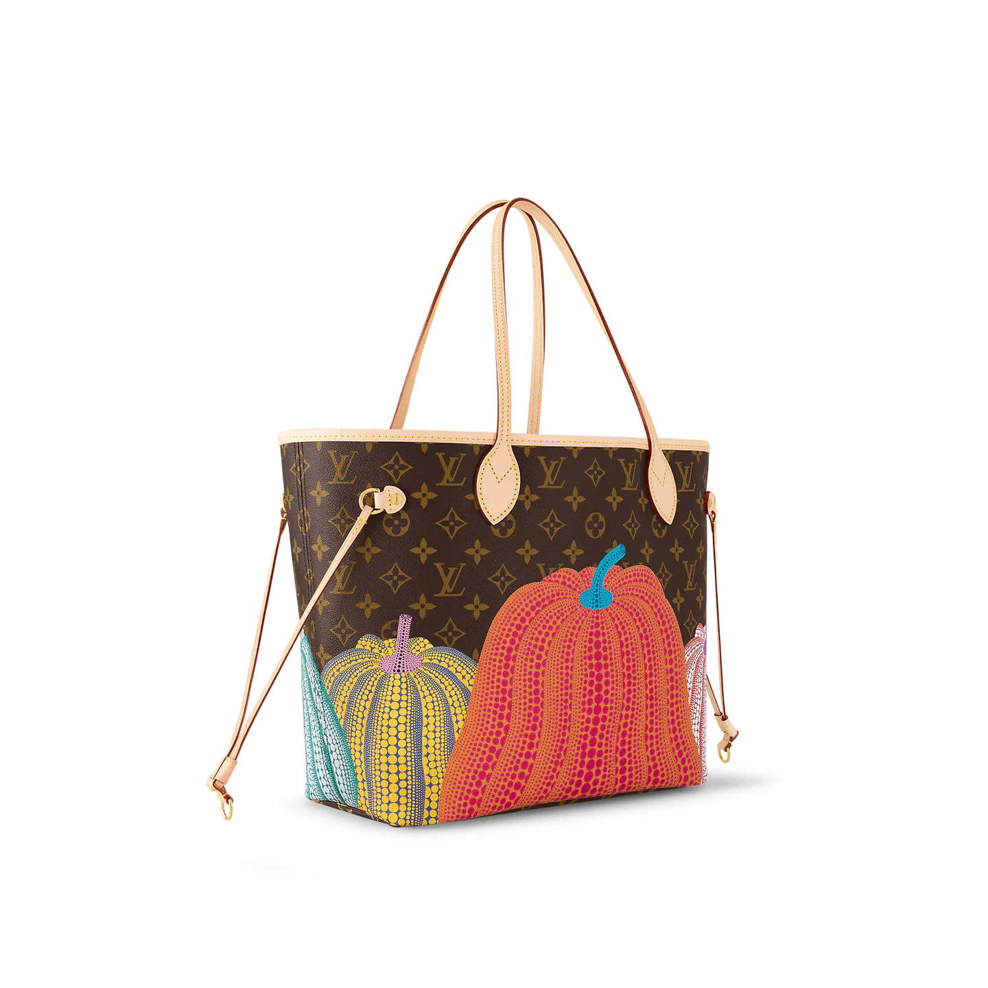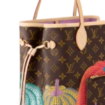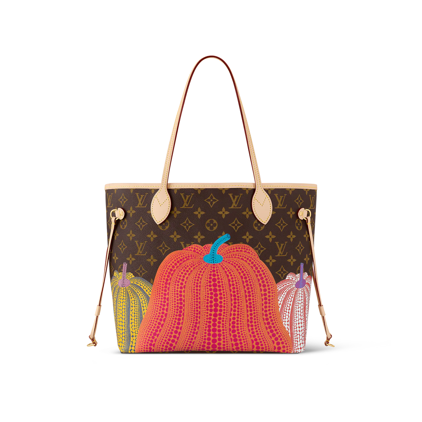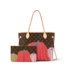 Dreamed up for the exceptional Louis Vuitton x Yayoi Kusama collection. the LVxYK Neverfull MM features a print inspired by a recurring theme in the celebrated Japanese artist’s work. Kusama has long been enchanted by pumpkins. which she prizes for their warmth and amusing shape. Here her stylized dotted pumpkins appear in bright colors on the House’s signature Monogram canvas. A practical bag and an ode to creativity and craftsmanship.