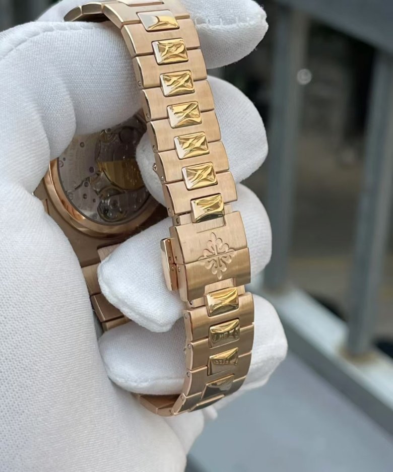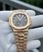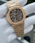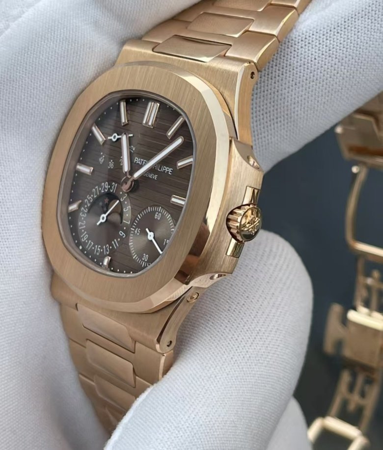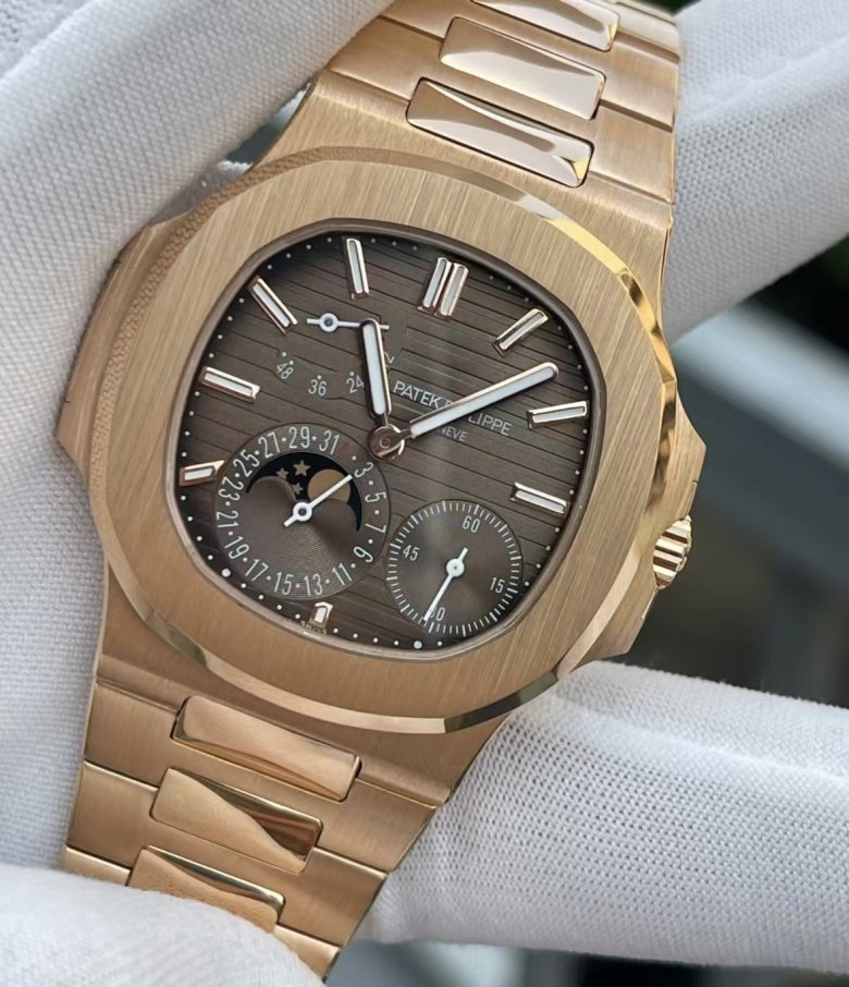 Patek Philippe Nautilus Moon Phase Rose Gold Watch 5712/1R-001 5712/1R?Self-winding mechanical movement. Caliber 240 PS IRM C LU. Date by hand. Moon phases. Power reserve indication. Small seconds. Dial Sunburst brown, black-gradient rim, horizontally embossed, gold applied hour markers with luminescent coating. Case Rose gold. Screw-down crown. Sapphire crystal case back. Water-resistant to 60 m. Diameter (10C4 oclock): 40 mm. Height: 8.52 mm.
