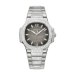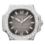 Patek Philippe Nautilus Women’s Watch 7014/1G-001, 18K white gold case, sapphire-crystal back, bezel set with 56 baguette diamonds (~ 2.42 ct), charcoal gray dial with luminescent coated gold applied numerals and diamond hour markers, caliber 324 S C self-winding movement with date in an aperture and center sweep second hand, approximately 35-45 hours of power reserve, 18K white gold bracelet set with 146 baguette diamonds (~ 8.76 ct), Nautilus fold-over buckle. Water resistant to 60 m.